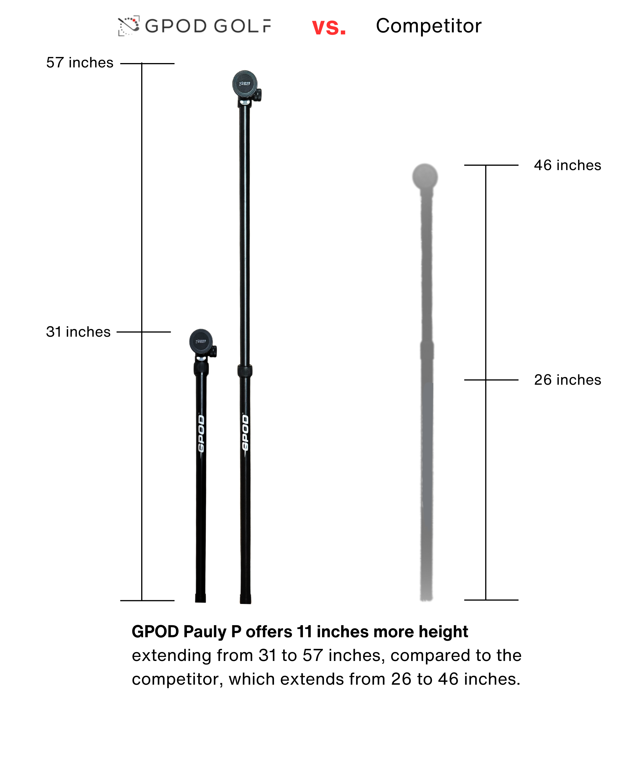 Introducing the Pauly P, the revolutionary adjustable stand designed to elevate your golf game and content creation. Crafted from durable, lightweight aluminum alloy, the Pauly P extends from 31" to 57" (the use of a GPOD Base, sold separately, will add an additional 5” to the overall heights) giving you the perfect height for any shot or recording scenario, indoor and outdoor. Whether you're analyzing your swing, filming instructional videos, or live streaming your round, the Pauly P is your all-in-one solution.